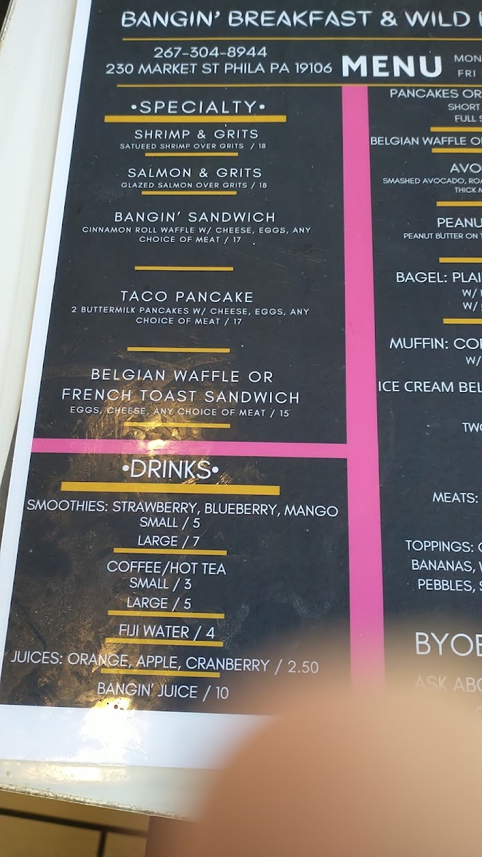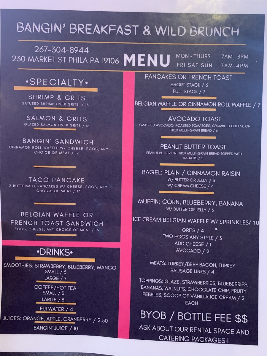 Located at 2699 N 2nd St, Philadelphia, Bangin Breakfast & Wild Brunch offers a vibrant dining experience infused with delightful Southern-inspired flavors. The menu celebrates breakfast and brunch all day, featuring standouts like the Avocado Toast topped with roasted tomatoes and crumbled cheese, and hearty Omelettes adorned with fresh veggies and optional meats. Indulge in their signature Bangin' Combo, a feast of pancakes, French toast, sausage, eggs, and more, guaranteed to satisfy.